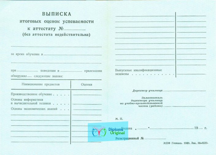 В число бланков училищ входят и те, что действовали в постсоветское время (с 1996 по 2002 гг.), и совершенно новые (2011-2013 гг.). Если эти временные промежутки не подходят вам по ряду причин, остальные периоды также доступны: бланки относительно современных колледжей образца 2002-2006 гг. или 2007-2010 гг. также в наличии. Таким образом, наша организация может удовлетворить потребности разных клиентов, соответственно их пожеланиям.